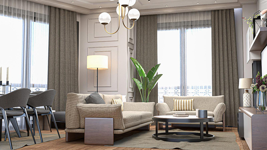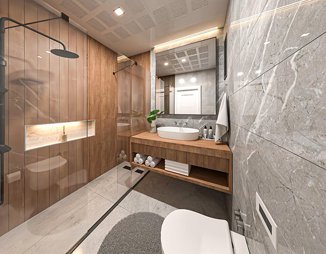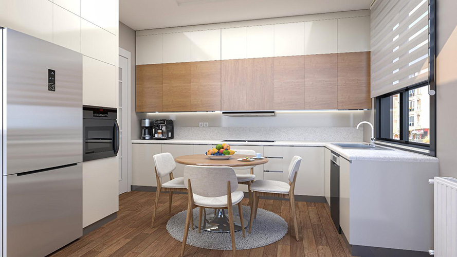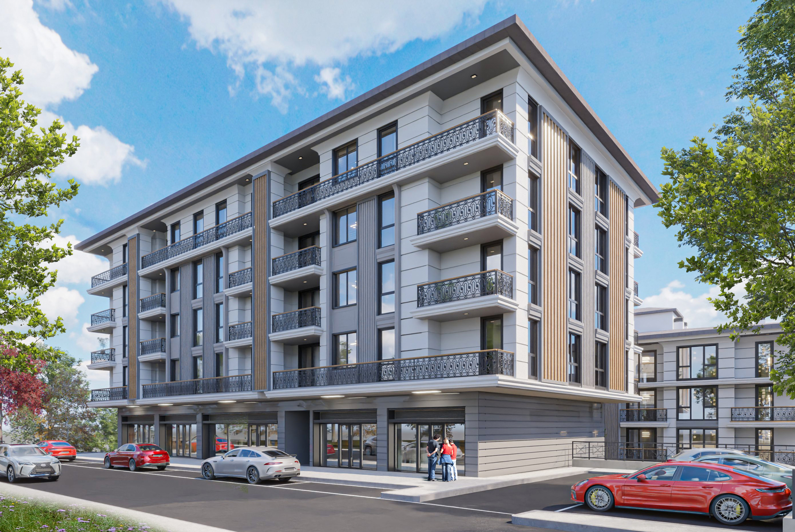 Geniş cam yüzeyler, balkonlar ve doğal malzeme görünümlü kaplamalar kullanılmıştır. Gri tonlardaki cephe kaplamaları, ahşap görünümlü dikey şeritlerle zenginleştirilmiştir. Her daireye ait balkon bulunmaktadır. Cephe boyunca balkonların sürekliliği sağlanmış, bu da hem görsel bütünlük hem de kullanıcı konforu açısından olumlu bir etki yaratmıştır. Çevrede yoğun ağaçlandırma, otopark çevresinde ve yol kenarlarında düzenlenmiş yeşil alanlar bulunur. Bu durum projeyi doğayla daha uyumlu hale getirmektedir.